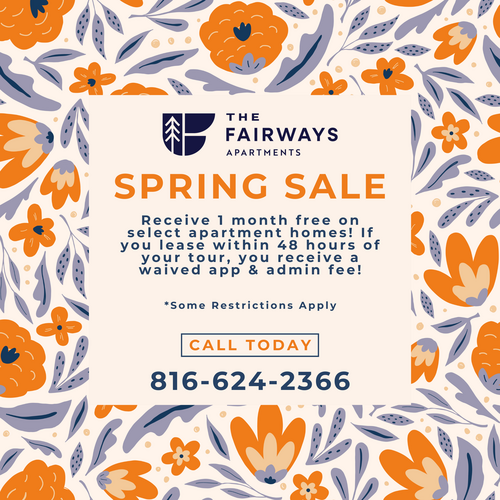 Experience the lifestyle you've always dreamed of in a pet-friendly apartment at The Fairways Apartment Homes, located near Fleming Park. Our garden-style apartments blend modern features with exceptional community amenities, providing the perfect balance of convenience and suburban tranquility. When you are on the go, you’ll appreciate our location being just minutes to major employers, Summit Woods Crossing, and St. Lukes East Hospital. Make The Fairways your new home today.